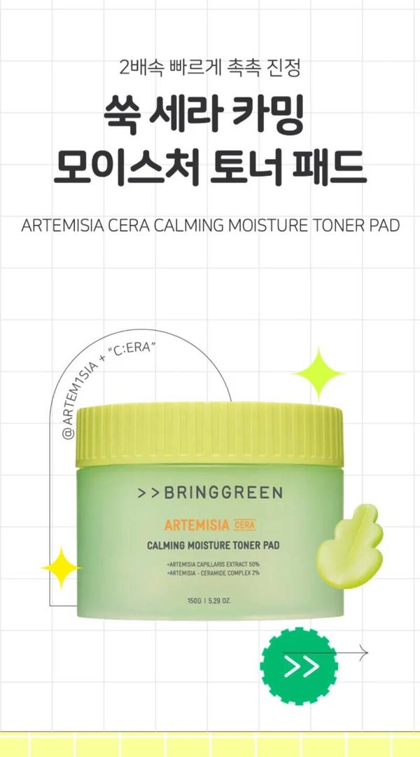 Le BRINGGREEN Artemisia Cera Calming Moisture Toner Pad offre une tonification rapide pour éliminer les cellules mortes de la peau et une hydratation 2 fois plus rapide.